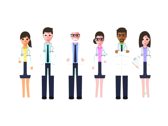 six animated doctors with white coats on